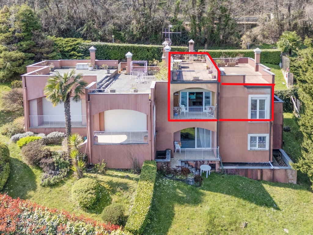 Completano la proprietà una spaziosa terrazza panoramica, accessibile tramite scala esterna, ideale per trascorrere momenti all’aperto con vista sull’Eremo di Santa Caterina del Sasso, tra gli scenari più suggestivi del Lago Maggiore, e un posto auto scoperto. La spiaggia privata, situata di fronte al residence, è riservata esclusivamente ai residenti.