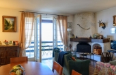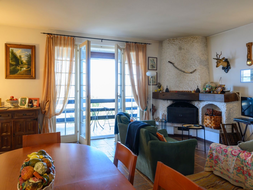 Piano terra: ingresso, cucina, luminoso soggiorno con camino e accesso al terrazzo coperto con vista lago, bagno
